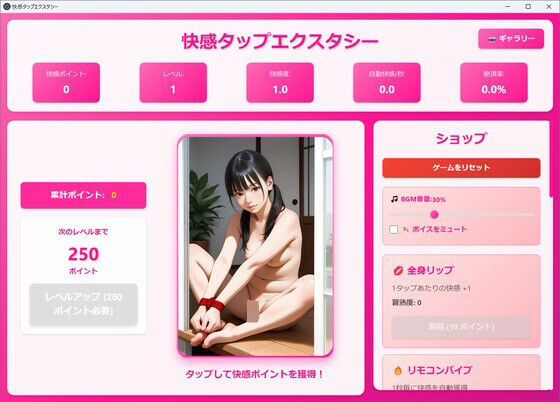 マインスイーパー 〜秘密のコレクション〜|| ま〇〇スイーパー - 秘密のコレクション ゲーム概要 クラシックなマインスイーパーに、特別なご褒美要素を加えた大人向けパズルゲーム。 地雷を避けながらフィールドを開放すると、隠された秘密の画像が徐々に明らかになります。 主な機能 ? 2つのゲームモード - 真剣モード(地雷いっぱい): 本格的な難易度で挑戦 - ご褒美モード(地雷が半分): 地雷数が半分になり、気軽に楽しめる ? 3つの難易度 - 初級: 9×9マス、地雷10個 - 中級: 16×16マス、地雷40個 - 上級: 16×30マス、地雷99個 ? 刺激ボタン - 一番広いフィールドを自動的に開く便利機能 - クリックするとセクシーな脈動エフェクトとハートが飛び散る演出 - ボイスが必ず再生される特別な機能 ?? ギャラリーシステム - 各難易度100枚、合計300枚の画像コレクション - クリアした画像は永久保存され、いつでも閲覧可能 - 解放した画像数をカウントして進捗を確認 ? 充実のオーディオ機能 - BGM再生機能(音量調整可能) - 進捗に応じて変化するボイス演出 - BGMとボイスを個別に音量調整・ON/OFF可能 ? 美しいビジュアル - ピンクを基調としたかわいい・セクシーなデザイン - 背景に隠された画像が透けて見える演出 - 見やすい白縁取りの数字表示 遊び方 1. 好きな難易度とモードを選択 2. マインスイーパーのルールで地雷を避けながらマスを開く 3. 困ったときは「? 刺激して(はーと)」ボタンでヒント 4. すべての安全なマスを開くとクリア! 5. 秘密の画像がギャラリーに追加されます --- 対応OS: Windows 10/11 容量: 約263MB 形式: ポータブル版音声素材 (音声素材_Pincree 音声素材_ピンクリー: )