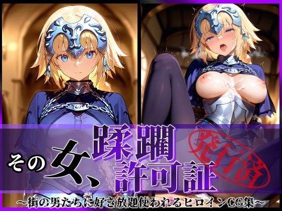 その女、蹂躙許可証発行済み -街の男たちに好き放題使われるヒロインCG集- ジャンヌ編|| 作品紹介【あらすじ】蹂躙許可証…それが発行された女であれば街の人間は誰でもその女を好き放題にすることができるという。これは男たちの欲望によって蹂躙され、弄ばれ、堕とされるヒロインの記録。【作品コンセプト】蹂躙×着エロ×美脚がコンセプトの作品となります。苦渋や快楽に歪むヒロインの表情はもちろん、服を着ているからこそ感じるエロスを存分にお楽しみください。(着エロだけにならないよう裸や裸に近いCGも複数収録しています)また、本シリーズは特に足に力を入れて制作しています。スラっとした足を存分に堪能していただけると思います。【作品情報】フルカラー画像:png画像ファイル250枚(差分無し・一部擬音付き)画像サイズ:1824×1248(縦長)【収録内容】・パイズリ・フェラ・バイブ責め・ぶっかけ・拘束・潮吹き・中出し・乱交・キスハメ・野外・露出・青姦・辱め・ぶっかけ・アへ顔・断面図あり・快楽堕ち・口内指責め・髪引き【作品作成にあたって】※本作はStableDiffusionを使用しています。※加筆修正はしておりますが、AIイラストのため、 一部に破綻や不自然さが含まれる場合がございます。※犯罪行為を助長する意図は一切ございません。何卒ご理解いただけますようお願い申し上げます。